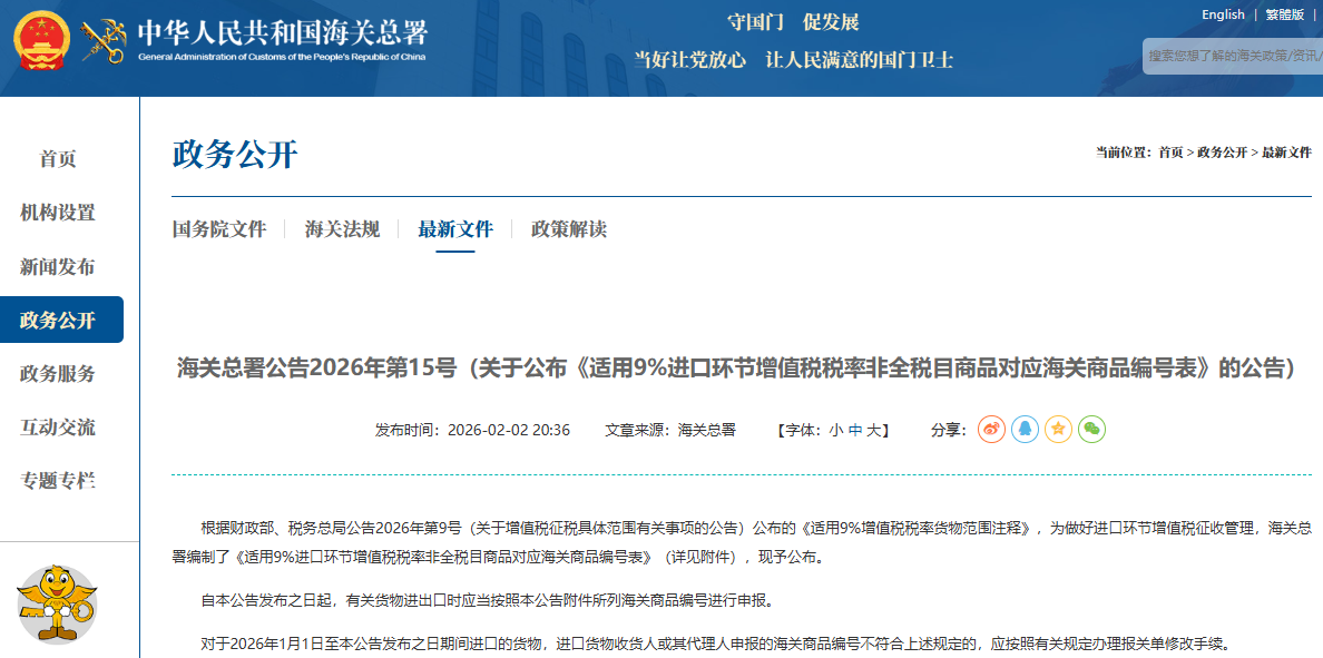 ● According to Announcement No. 15 released by the General Administration of Customs on February 2, 2026, the Value-Added Tax (VAT) rate for over 70 types of imported goods has been lowered to 9%. Covering multiple industries, this move aims to help enterprises move forward with less burden!!